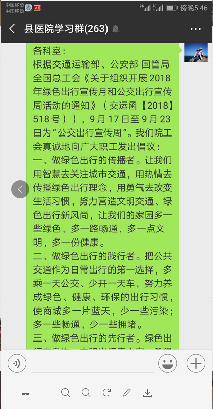 9月17日至9月23日公交宣传周期间,县医院工会多措并举,营造绿色出行的良好氛围。一是利用微信公众号发出了“绿色出行 从身边做起”的倡议书,号召广大职工从宣传者、先行者、参与者、志愿者做起,做绿色出行的传播者和践行者;二是在门诊一楼大厅电子显示屏全天滚动播放“绿色出行、从身边做起”宣传标语;三是组织我院市劳模周百武、市五一劳动奖章获得者熊晨晖、胡明文,县劳模杨梦华、王剑等5人进行了劳模先进亮承诺,呼吁广大职工礼让行人的承诺活动。