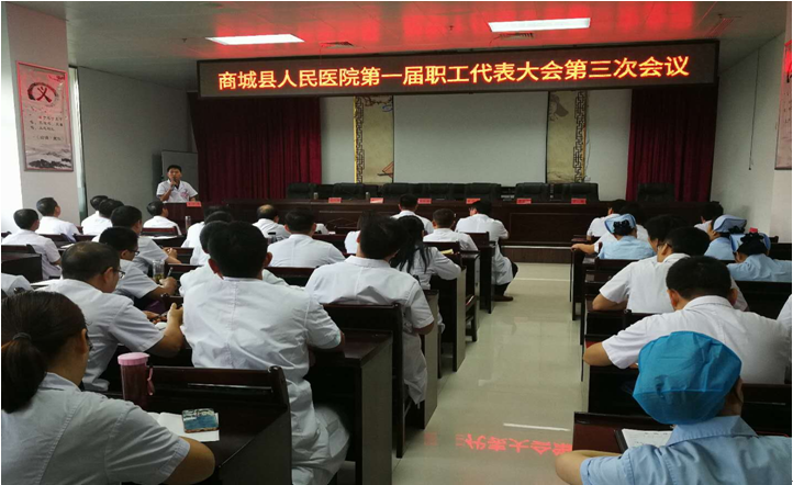 2018年9月8日下午4点,商城县人民医院第一届职工代表大会第三次会议在病房楼一楼大会议室召开。全体院领导班子成员、全院各科室职工代表及相关职能科室负责人列席代表56人参加了会议。大会由院工委主任何卫国主持。