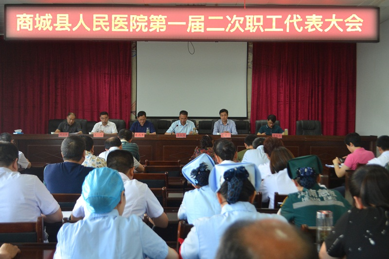 2018年6月12日下午,商城县人民医院第一届职工代表大会第二次会议在病房楼一楼大会议室召开。大会由院工委主任何卫国主持。院领导班子成员、各科室职工代表及相关职能科室负责人共计51人参加了会议。